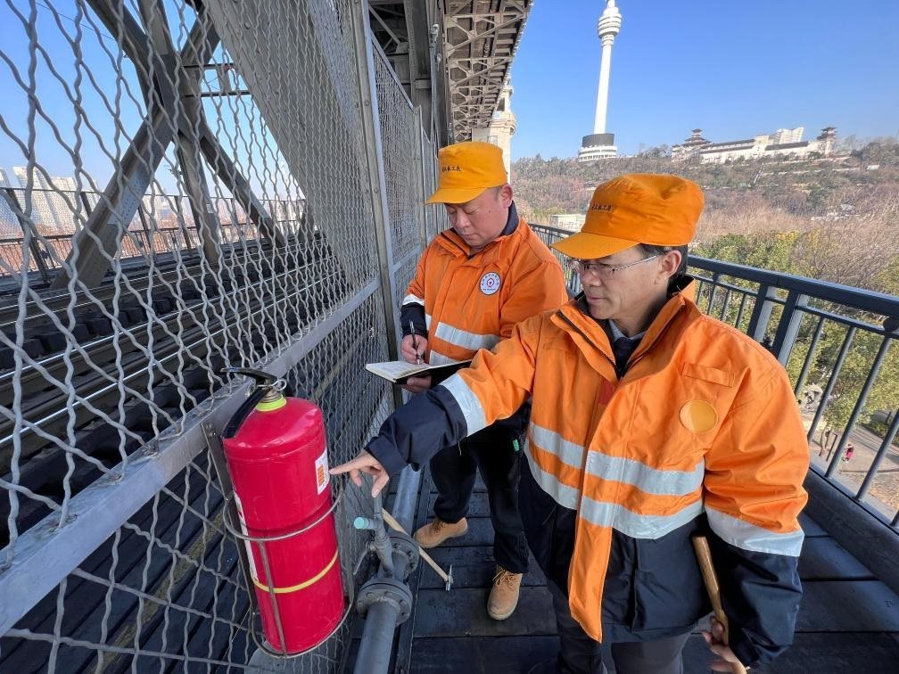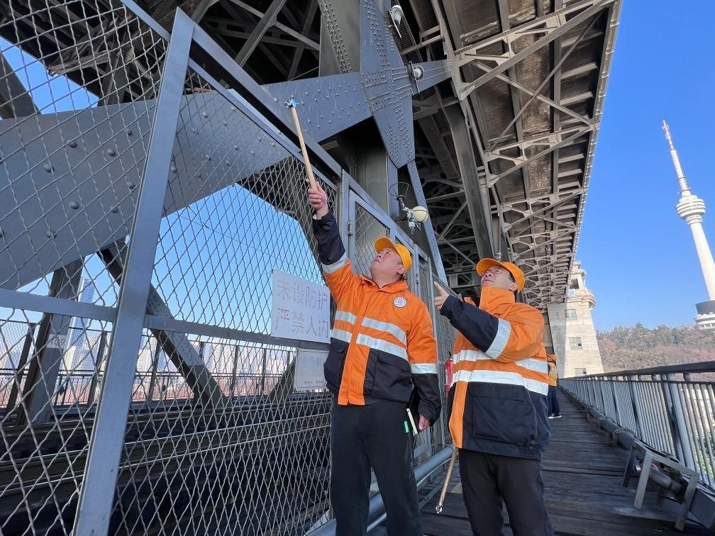 2月12日,武漢長(zhǎng)江大橋橋梁車間員工陳卿明(左)、趙福武在武漢長(zhǎng)江大橋上巡檢。(朱叢蓓 攝)