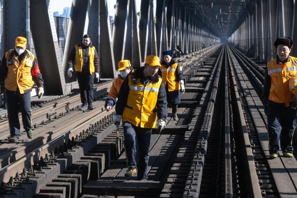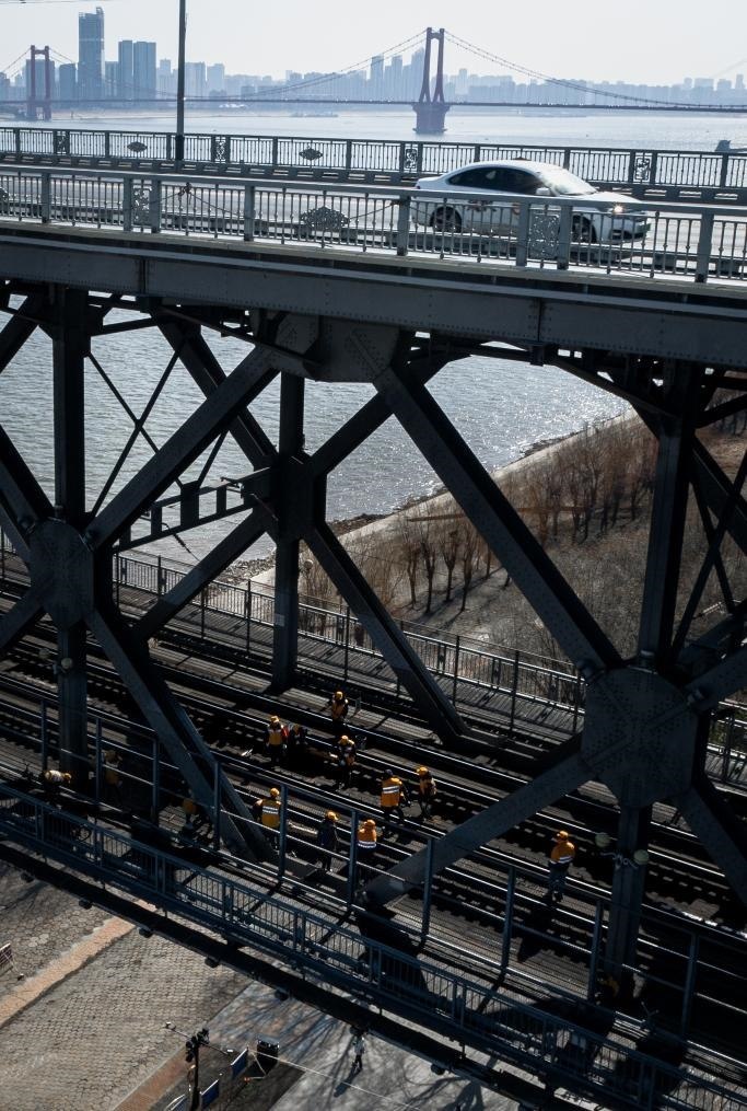 農(nóng)歷大年初三,湖北武漢陽光明媚。“萬里長(zhǎng)江第一橋”——武漢長(zhǎng)江大橋宛若一條巨龍飛架于江水之上,氣勢(shì)恢宏。身穿工作服的陳卿明和同事,低頭、彎腰,循著大橋鐵道仔細(xì)地檢視鋼梁、枕木。