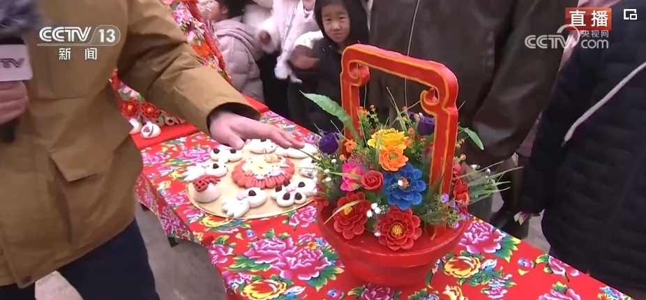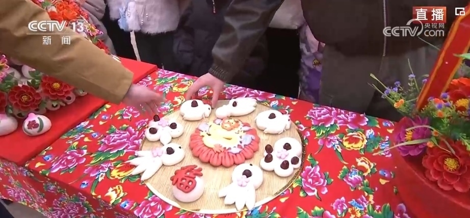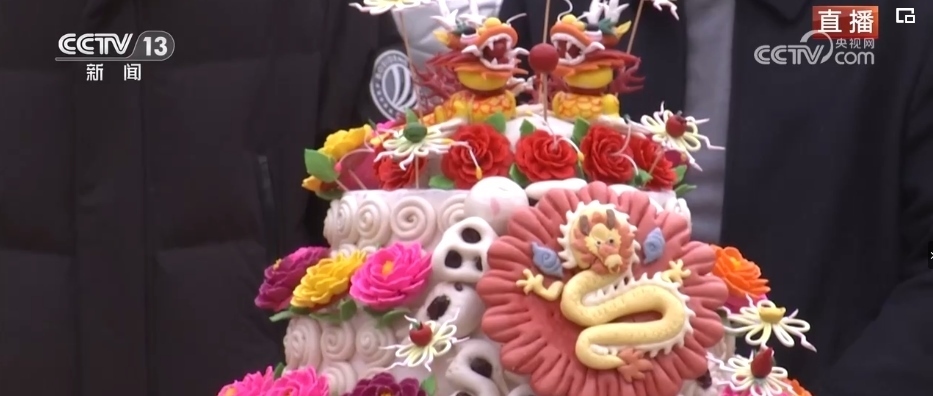 在春節(jié)期間,家家戶戶都會蒸年饃,每個年饃都有不同的寓意,花開富貴、步步高升等,龍年特色的花饃非常熱銷。這個龍型年饃上彩色的元素都是可以食用的,黃色的身子是南瓜汁,藍(lán)色是當(dāng)?shù)匾环N茶葉水調(diào)出來的。