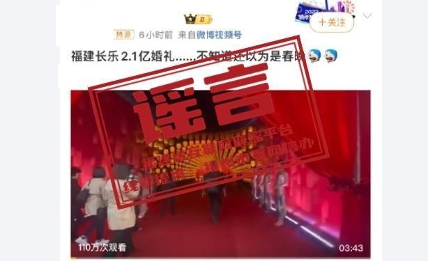 ·福建省互聯(lián)網(wǎng)辟謠平臺:“董事長之子婚宴斥資2.1億”嚴重失實,相關(guān)賬號禁言30日。