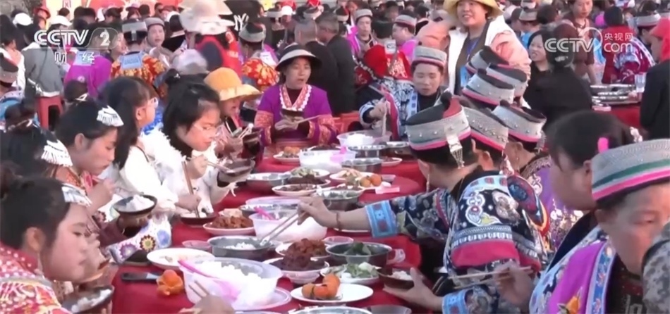 隨后,三合苗寨圍繞著“花樹”擺起長桌宴,苗族同胞和游客們一起喝起水花酒、跳起蘆笙舞,一起歡慶新春到來。今年春節(jié)期間,安順各地將舉行上百場(chǎng)苗族跳花活動(dòng)。