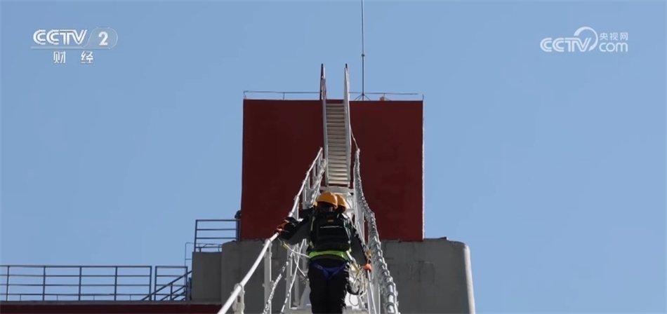 經(jīng)過30分鐘左右的攀爬,他們到達了整座大橋最高的位置,開始檢查鞍罩。鞍罩就是像馬鞍一樣的罩子,主要是為了保護邊跨和主跨的連接部位,鞍罩內(nèi)還裝有大橋健康檢測系統(tǒng)和除濕系統(tǒng),實時監(jiān)控大橋的健康狀態(tài)。