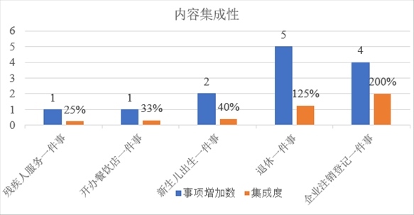 從內(nèi)容集成度看,5項相關(guān)“一件事”的事項集成比例均有不同程度提升。“殘疾人服務(wù)一件事”增加1個事項,集成度提升25%?!伴_辦餐飲店一件事”增加1個事項,集成度提升33%?!靶律鷥撼錾患隆痹黾?個事項,集成度提升40%。“退休一件事”增加5個事項,集成度提升125%?!捌髽I(yè)注銷登記一件事”增加4個事項,集成度提升200%。