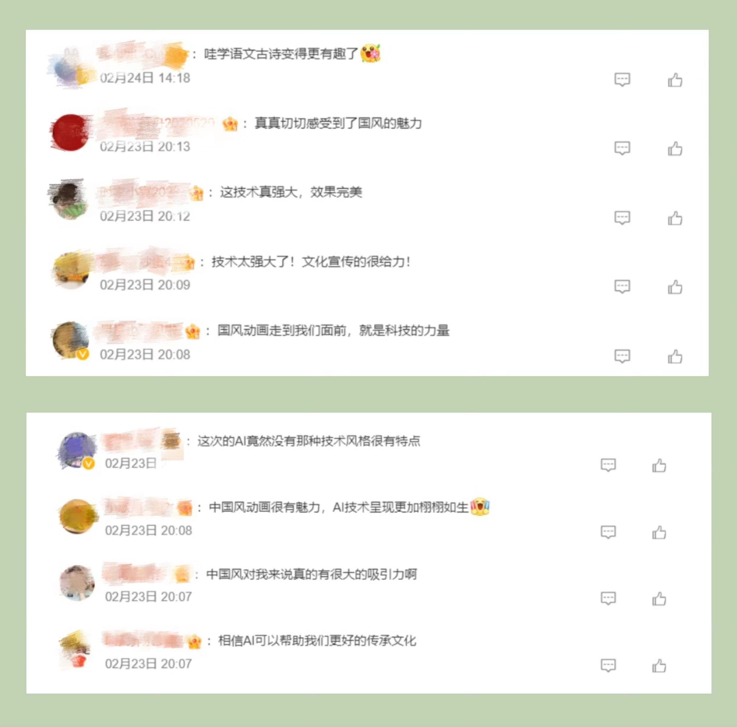 節(jié)目探索詩畫融通的國風(fēng)動畫片新呈現(xiàn),讓廣大青少年進一步加深了對中國經(jīng)典詩詞的理解和喜愛。“AI”“總臺”“千秋詩頌”等成為網(wǎng)友熱議高頻詞。截至2月27日20:00,話題#千秋詩頌#閱讀量超791萬次。網(wǎng)友紛紛留言:“看到這個系列片,我真的深深感受到了中國傳統(tǒng)文化的深厚底蘊。這些古詩詞深入骨髓,流淌在我們的血液中,是我們國家的文化符號”“以AI為媒,央視制作的這部國風(fēng)動畫片傳承了經(jīng)典,喚醒了古韻的新生命”“唯美的畫面讓人動容,用視覺的形式了解《別董大》這一首古老的詩歌更別有一番韻味”“這種科技與動畫片的結(jié)合,恰好是現(xiàn)在小朋友們和大朋友們所需要的”。
