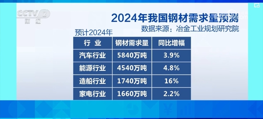 根據(jù)冶金工業(yè)規(guī)劃研究院的綜合預(yù)測(cè),2024年,我國(guó)鋼材需求量為8.75億噸。從下游行業(yè)消費(fèi)來(lái)看,預(yù)計(jì)2024年,汽車行業(yè)的鋼材需求為5840萬(wàn)噸,同比增長(zhǎng)3.9%;能源行業(yè)的鋼材需求為4540萬(wàn)噸,同比增長(zhǎng)4.8%;造船行業(yè)的鋼材需求為1740萬(wàn)噸,同比增長(zhǎng)16%;家電行業(yè)的鋼材需求為1660萬(wàn)噸,同比增長(zhǎng)2.2%。