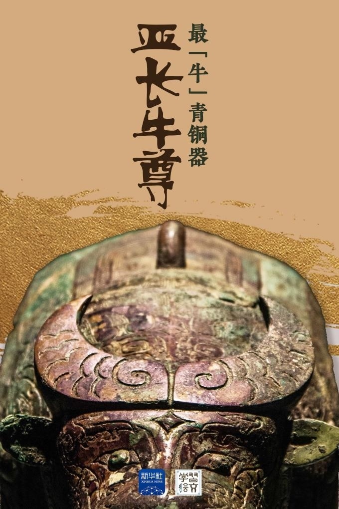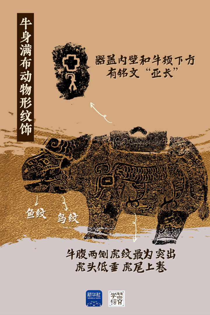 亞長(zhǎng)牛尊是截至目前殷墟發(fā)現(xiàn)的唯一一件牛形青銅容器?!皝啞笔俏涔俚姆Q謂,“長(zhǎng)”是家族姓氏,墓主人亞長(zhǎng)是商王朝南部“長(zhǎng)”國(guó)的部落首領(lǐng)。