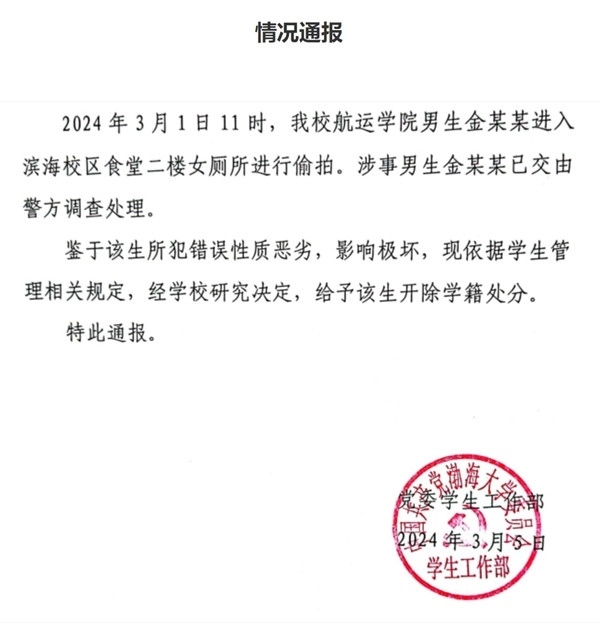·渤海大學(xué)一男生進(jìn)入食堂女廁偷拍,被開(kāi)除學(xué)籍。