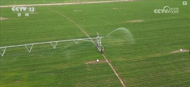 根據(jù)農(nóng)業(yè)專家的精準測算和調度,園區(qū)工作人員啟動了大型指針式噴灌機。