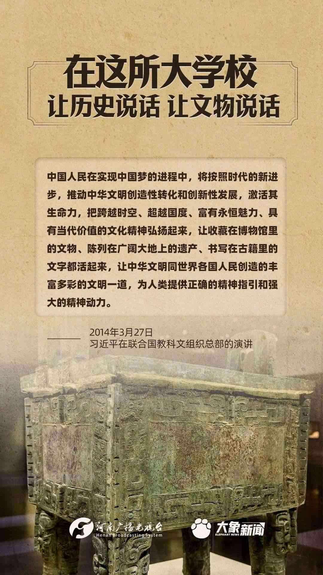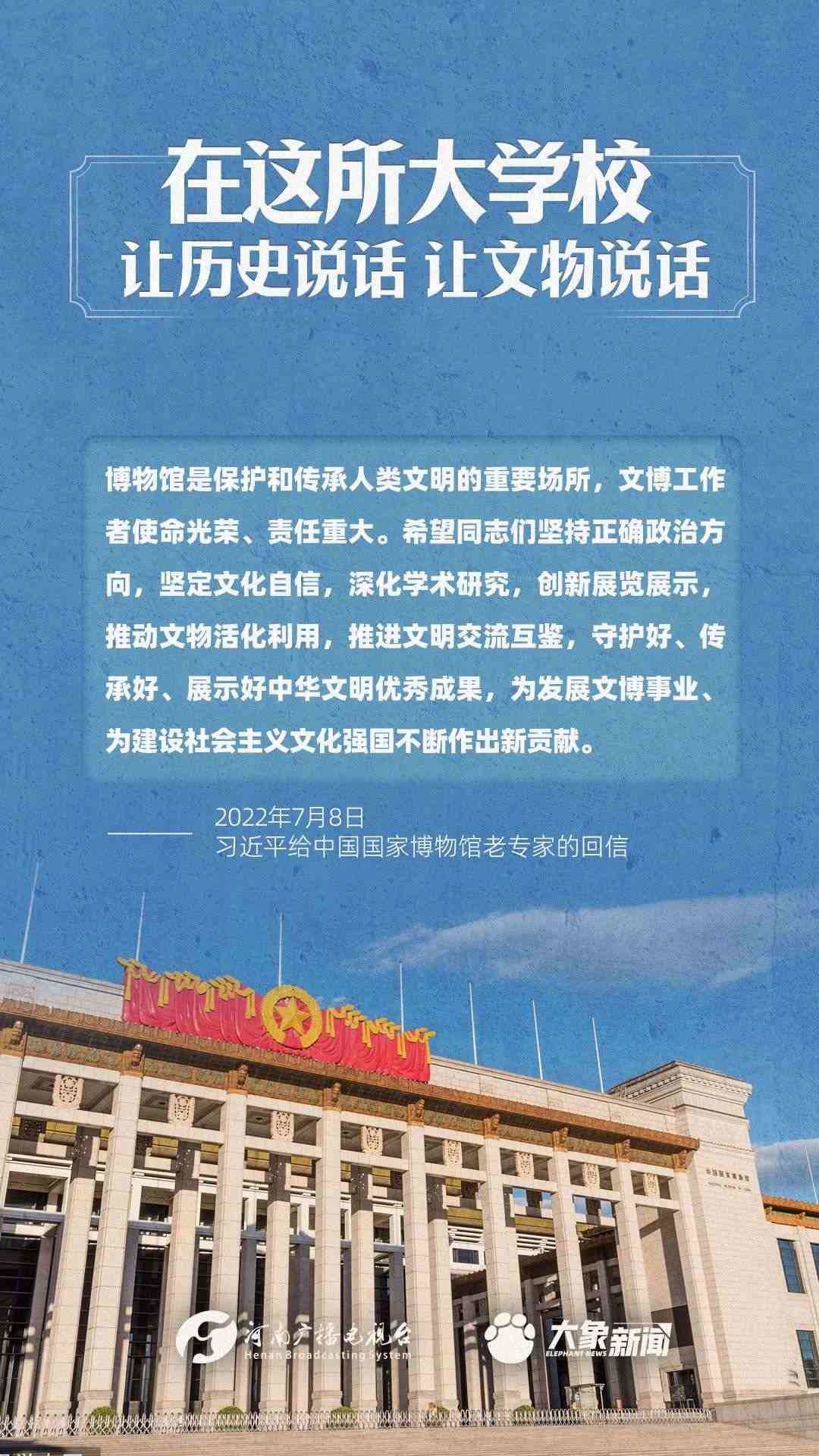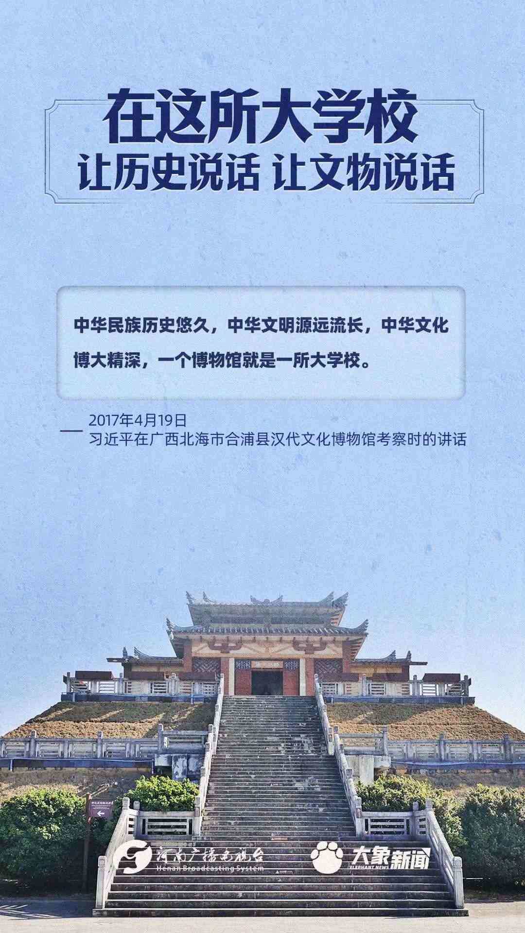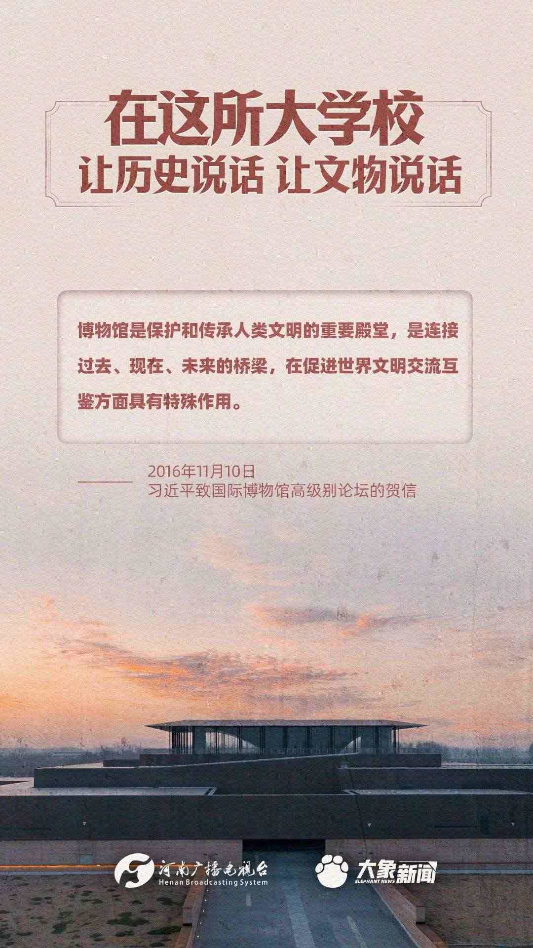 習(xí)近平總書記一直高度重視博物館工作,多次作出重要講話,強(qiáng)調(diào)“一個(gè)博物院就是一所大學(xué)?!?,指出“讓歷史說話,讓文物說話”,要求“守護(hù)好、傳承好、展示好中華文明優(yōu)秀成果”等等,金句連連。大象新聞進(jìn)行了認(rèn)真梳理,邀您一起學(xué)習(xí)。