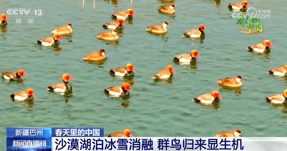 伴隨著陣陣鳥鳴,我們來到新疆巴州尉犁縣羅布淖爾國家濕地公園,碧綠的水面上,成群結隊的赤嘴潛鴨、赤麻鴨等鳥類時而用翅膀拍打水面展翅飛翔,時而三五成群在水中嬉戲、覓食,群鳥與黃沙、碧水、葦叢、胡楊交相輝映,形成一幅生機勃勃的春日畫卷。