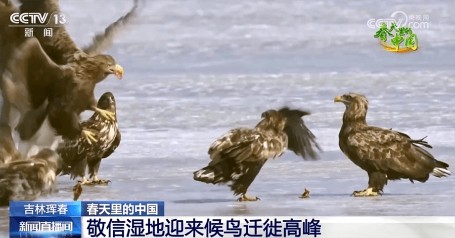 在琿春敬信濕地的龍山湖面上,數(shù)十只白尾海雕、虎頭海雕等珍稀候鳥嬉戲打鬧、爭搶食物,熱鬧不已。湖邊的攝影師們不時按動快門,捕捉鳥類舞動的精彩瞬間。