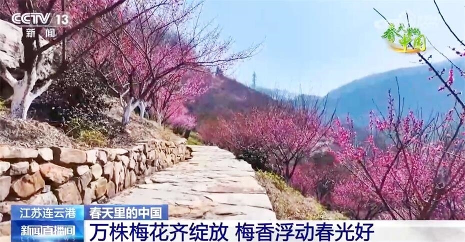 春日暖陽(yáng)中,江蘇連云港花果山漫山遍野的梅花悄然綻放,紅梅花開(kāi)似海、明媚驚艷,遠(yuǎn)看如云霞燦爛,近聞?dòng)杏浒迪??;ü矫穲@經(jīng)過(guò)多年的栽植培育,有紅梅、美人梅、綠萼梅等梅樹(shù)2萬(wàn)多株。