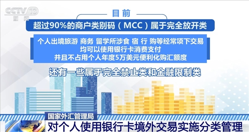 根據(jù)規(guī)定,目前,超過(guò)90%的商戶類別碼屬于完全放開(kāi)類,個(gè)人出境旅游、商務(wù)、留學(xué)所涉食、宿、行、購(gòu)等經(jīng)常項(xiàng)下交易,均可以使用銀行卡消費(fèi)支付,并且不占用個(gè)人年度5萬(wàn)美元便利化購(gòu)匯額度。此外,還有一些屬于完全禁止類和金融限制類。