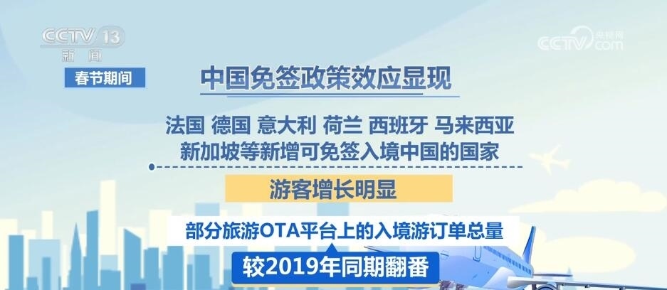 根據(jù)國(guó)家移民局統(tǒng)計(jì)數(shù)據(jù),2024年1月至2月,外籍人員入出境共計(jì)294.5萬(wàn)人次,環(huán)比增長(zhǎng)2.3倍,恢復(fù)至疫情前的41.5%。春節(jié)期間,中國(guó)免簽政策效應(yīng)顯現(xiàn),法國(guó)、德國(guó)、意大利、荷蘭、西班牙、馬來(lái)西亞、新加坡等新增可免簽入境中國(guó)的國(guó)家,游客增長(zhǎng)明顯,部分旅游OTA平臺(tái)上的入境游訂單總量較2019年同期翻番。