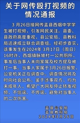 ·官方通報“山西盂縣一學生在公廁內被打”:公安機關介入調查。