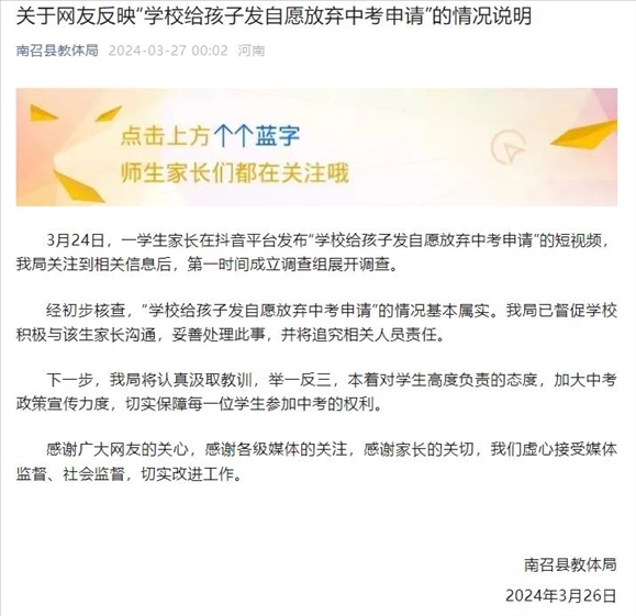 ·網傳河南一學校勸學生自愿放棄中考,縣教體局:基本屬實,將追責。
