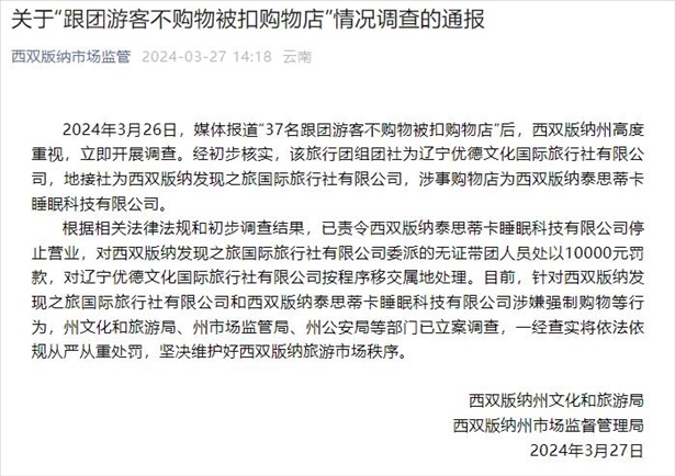 ·云南西雙版納通報“37名跟團游客不購物被扣購物店”調查情況:立案調查。