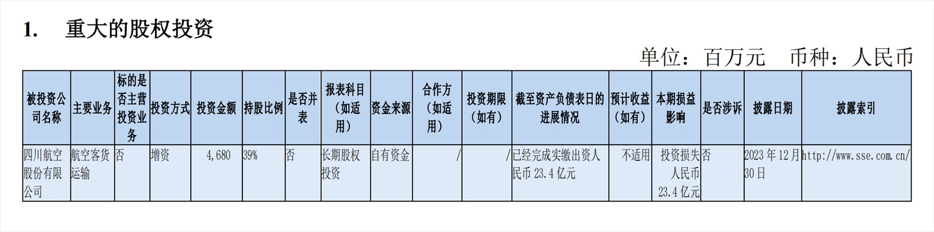 南方航空副董事長、總經(jīng)理韓文勝在3月29日的業(yè)績說明會上也提到,四川航空前期未確認(rèn)的損失自2021年6月開始形成,截至2023年12月31日增資當(dāng)期,確認(rèn)虧損23.4億元,尚未確認(rèn)26.6億元。投資損失產(chǎn)生的原因主要是疫情期間四川航空累計經(jīng)營虧損,超出南航對四川航空的投資成本。