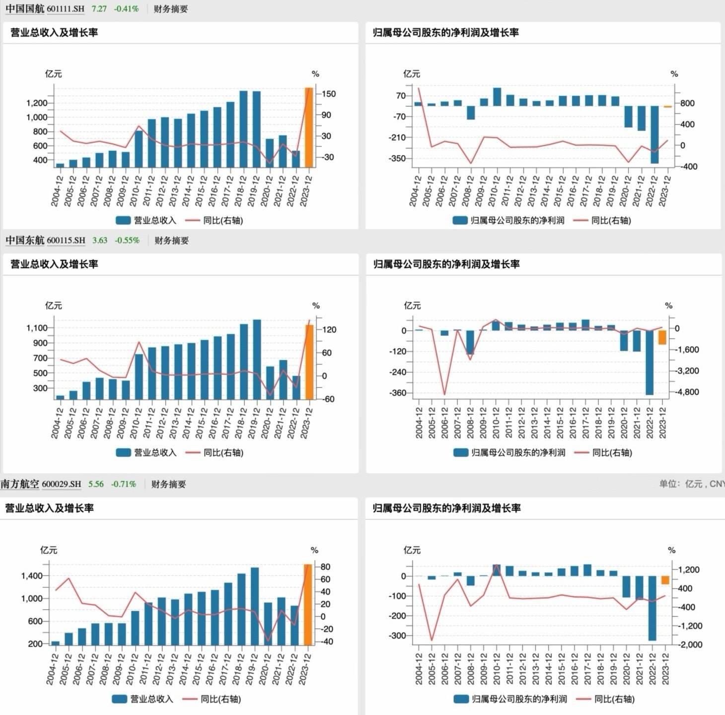 總體來看,三大航2023年業(yè)績集體仍未實現(xiàn)扭虧,但整體經(jīng)營業(yè)績上有明顯改善,營收均實現(xiàn)倍增恢復(fù)。去年前三季度業(yè)績亮眼,多項數(shù)據(jù)創(chuàng)新很高,但去年第四季度屬于傳統(tǒng)民航客運(yùn)淡季,其間不少航線價格都會環(huán)比大幅回落。具體來看航司業(yè)績,南方航空去年營收最高,達(dá)到了1599.29億元,國航其次,營收為1411億元,東航營收為1137.41億元,分別同比增長超八成、增超1.6倍、增超1.4倍。值得注意的是,其中國航和南航去年營收已創(chuàng)歷史新高。