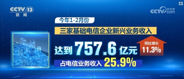 數(shù)據(jù)顯示,2024年1—2月份,三家基礎(chǔ)電信企業(yè)新興業(yè)務(wù)收入達到757.6億元,同比增長11.3%,占電信業(yè)務(wù)收入的25.9%,其中,云計算和大數(shù)據(jù)收入分別同比增長17.3%和30.3%。截至2月末,三家基礎(chǔ)電信企業(yè)發(fā)展蜂窩物聯(lián)網(wǎng)終端用戶23.64億戶,占移動網(wǎng)終端連接數(shù)比重達57.5%。