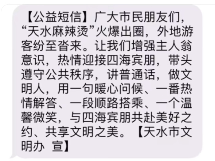 事實上,自3月以來天水在網(wǎng)絡(luò)“出圈”后,游客就絡(luò)繹不絕。有多位當?shù)鼐W(wǎng)友“曬”的消息顯示,3月20日收到天水市發(fā)布的“公益短信”,建議當?shù)厥忻瘛霸鰪娭魅宋桃庾R,熱情迎接四海賓朋……用一句暖心問候、一番熱情解答、一段順路搭乘、一個溫馨微笑,與四海賓朋共赴美好之約……”