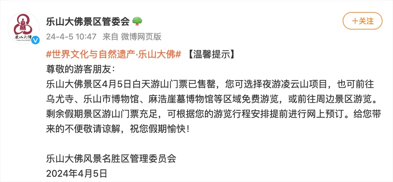 而據(jù)樂山大佛景區(qū)管委會發(fā)布的公告,4月4日15:04,樂山大佛景區(qū)當日的白天游山門票已售罄;4月5日10:47,樂山大佛景區(qū)當日的白天游山門票就已售罄。