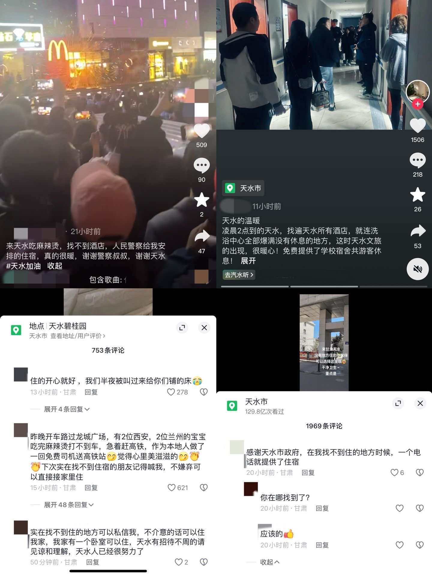 在社交平臺上,不少網(wǎng)友發(fā)布了找不到住宿而被幫助的內(nèi)容,紛紛表示“感謝天水”。