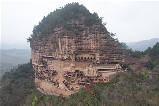 4月5日,游客在位于天水市麥積區(qū)的麥積山石窟游覽(無人機照片)。新華社 圖