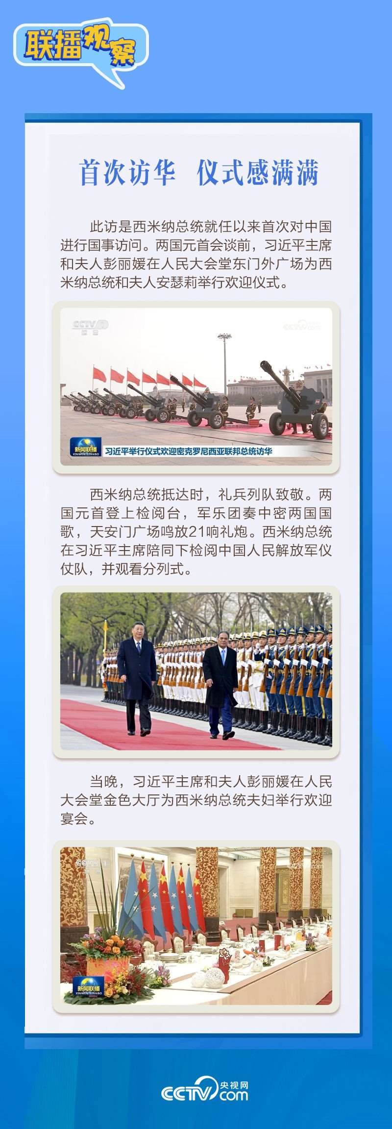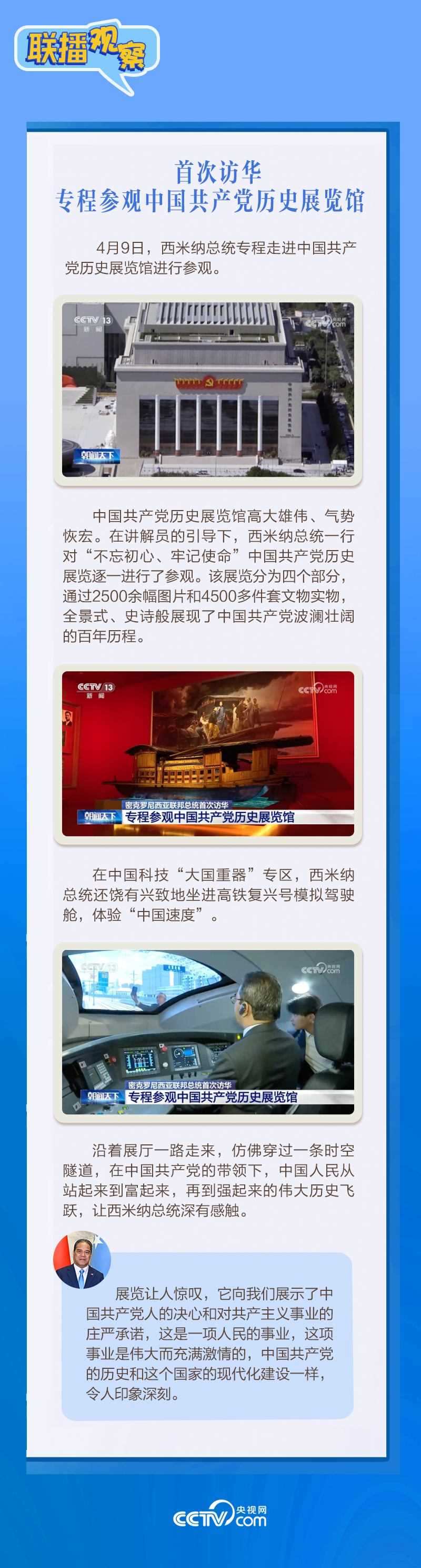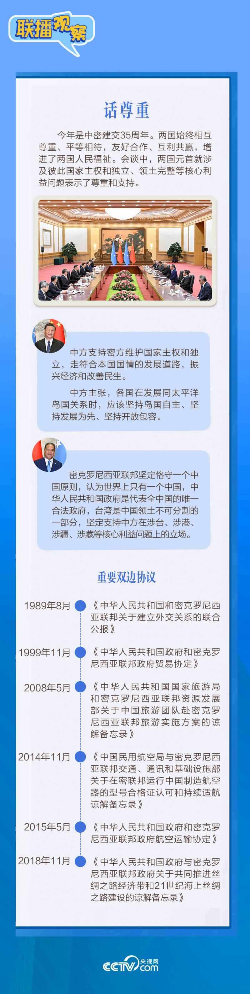應(yīng)習(xí)近平主席邀請,密克羅尼西亞聯(lián)邦總統(tǒng)韋斯利·西米納于4月5日至12日對(duì)中國進(jìn)行國事訪問。4月9日下午,習(xí)近平主席在北京人民大會(huì)堂同西米納總統(tǒng)舉行會(huì)談,就雙邊關(guān)系發(fā)展及共同關(guān)心的問題深入交換意見。雙方會(huì)談哪些細(xì)節(jié)值得關(guān)注?央視網(wǎng)《聯(lián)播觀察》帶您了解。