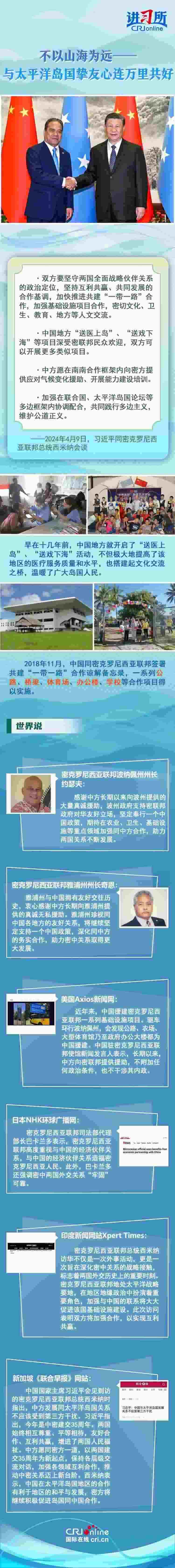 4月9日下午,中國國家主席習(xí)近平在北京同密克羅尼西亞聯(lián)邦總統(tǒng)西米納舉行會談時(shí)表示,每次見到太平洋島國的朋友,都感到很親切,中國地方“送醫(yī)上島”、“送戲下?!钡软?xiàng)目深受密聯(lián)邦民眾歡迎,中方愿繼續(xù)為島國發(fā)展提供力所能及的支持,開展三方或多方合作。
