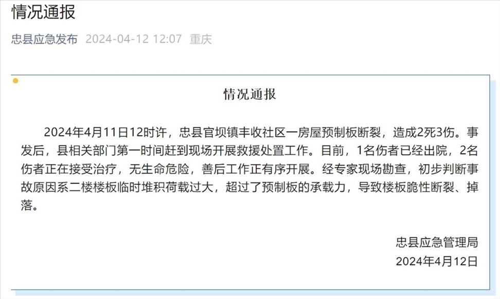 ·重慶一房屋預(yù)制板斷裂致2死3傷,鎮(zhèn)政府:已成立專班處理。