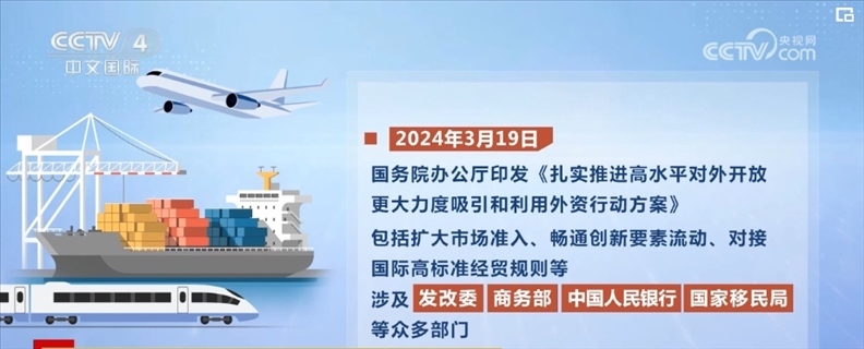2024年3月19日,國務(wù)院辦公廳印發(fā)《扎實(shí)推進(jìn)高水平對外開放 更大力度吸引和利用外資行動(dòng)方案》,包括擴(kuò)大市場準(zhǔn)入、暢通創(chuàng)新要素流動(dòng)、對接國際高標(biāo)準(zhǔn)經(jīng)貿(mào)規(guī)則等,涉及國家發(fā)展改革委、商務(wù)部、中國人民銀行、國家移民局等眾多部門。