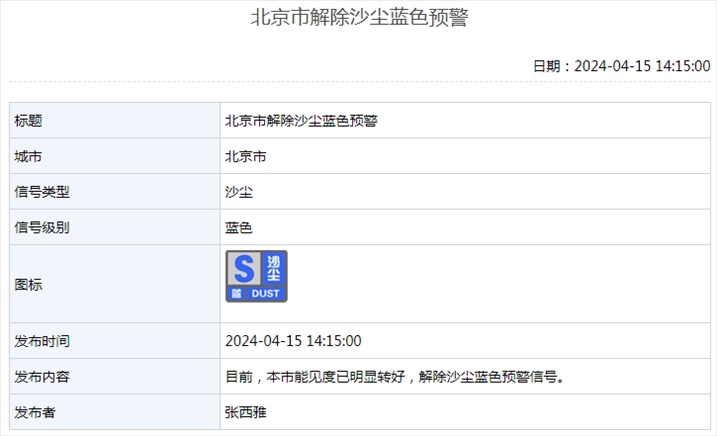4月15日14時15分,北京市解除沙塵藍色預警:目前,本市能見度已明顯轉好,解除沙塵藍色預警信號。