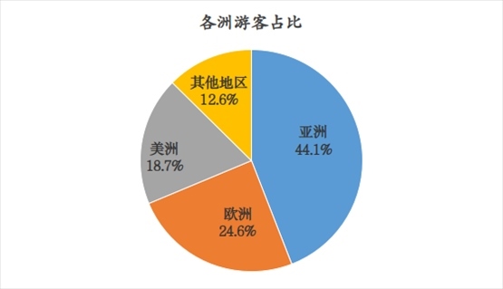 一、近程市場恢復(fù)良好。港澳臺地區(qū)游客恢復(fù)速度較快,合計為9.5萬人次,恢復(fù)到2019年的80.1%。游客占比方面,亞洲游客(不包括港澳臺地區(qū))占比為44.1%,較2019年提升7.2個百分點,東南亞地區(qū)游客恢復(fù)情況最好,其中主要客源國為馬來西亞、泰國、新加坡。