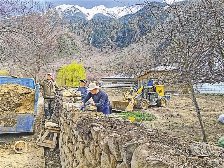 圖為村民強(qiáng)巴一家在給果園砌圍墻。