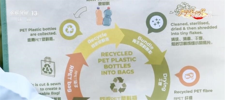 記者發(fā)現(xiàn)了一種用PET塑料瓶為原料制成的環(huán)保購物袋。PET簡稱聚酯,是一種常見的塑料材料,企業(yè)將這類塑料瓶回收后,經(jīng)過處理變成細(xì)小的瓶片,再經(jīng)融化和擠壓后變成纖維、織成布,最后就得到了一個可以循環(huán)使用的購物袋。