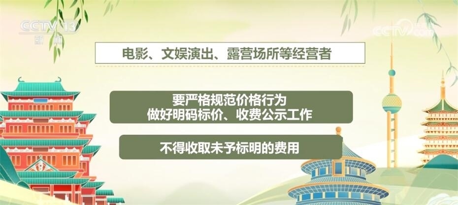 電影、文娛演出、露營(yíng)場(chǎng)所等經(jīng)營(yíng)者要嚴(yán)格規(guī)范價(jià)格行為,做好明碼標(biāo)價(jià)、收費(fèi)公示工作,不得收取未予標(biāo)明的費(fèi)用。
