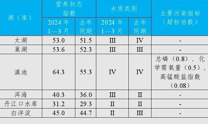 1—3月,監(jiān)測的201個重點湖(庫)中,水質(zhì)優(yōu)良(Ⅰ—Ⅲ類)湖庫個數(shù)占比82.1%,同比上升1.1個百分點;劣Ⅴ類水質(zhì)湖庫個數(shù)占比4.5%,同比下降0.1個百分點。主要污染指標為總磷、化學需氧量和高錳酸鹽指數(shù)。181個監(jiān)測營養(yǎng)狀態(tài)的湖(庫)中,中度富營養(yǎng)的9個,占5.0%;輕度富營養(yǎng)的31個,占17.1%;其余湖(庫)為中營養(yǎng)或貧營養(yǎng)狀態(tài)。其中,太湖和巢湖水質(zhì)均為良好、輕度富營養(yǎng);滇池為輕度污染、中度富營養(yǎng),主要污染指標為總磷、化學需氧量和高錳酸鹽指數(shù);洱海水質(zhì)良好、中營養(yǎng);丹江口水庫和白洋淀水質(zhì)均為優(yōu)、中營養(yǎng)。
