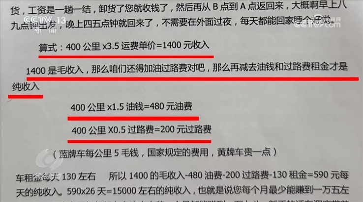 這些公司在和司機簽約時,根據(jù)司機個人情況的不同,對他們收取幾千元到幾萬元不等的費用。還沒掙錢就先交錢,而且交的還不少,司機們?yōu)槭裁磿母是樵傅亟贿@些錢呢?因為面試時,公司給司機們詳細算過他們的收入。