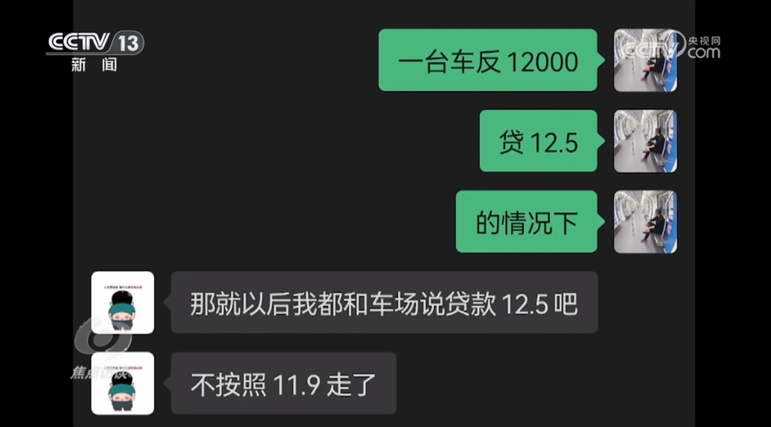 所謂物流公司內(nèi)部的一段聊天記錄顯示,一位司機購買的一臺車,物流公司的人和貸款公司一起運作,把原本應該是11.9萬元的貸款總額提高到12.5萬元,物流公司人員從中可以獲取12000元的返利。