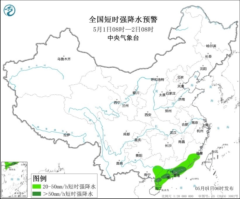 央視網(wǎng)消息:中央氣象臺5月1日06時發(fā)布強(qiáng)對流天氣藍(lán)色預(yù)警:預(yù)計5月1日08時至2日08時,廣東南部及沿岸海域等地的部分地區(qū)將有8-10級雷暴大風(fēng)或冰雹天氣,最大風(fēng)力11級以上;福建東南部、廣西東部、廣東中南部、海南島東北部及華南沿岸海域等地的部分地區(qū)將有小時雨量大于20毫米的短時強(qiáng)降水天氣,其中廣東南部及沿岸海域等地局地最大小時雨量大于50毫米,最大可達(dá)70毫米以上。