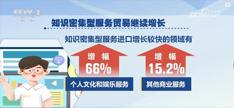 知識密集型服務貿(mào)易繼續(xù)增長。2024年一季度,知識密集型服務進出口7332.6億元,增長5.6%。其中知識密集型服務出口增長較快的領域有知識產(chǎn)權使用費、個人文化和娛樂服務,增幅分別為34.4%、19%;知識密集型服務進口增長較快的領域有個人文化和娛樂服務、其他商業(yè)服務,增幅分別為66%、15.2%。