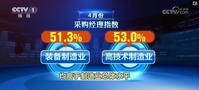 新動能繼續(xù)較快擴張。4月份,裝備制造業(yè)和高技術制造業(yè)采購經(jīng)理指數(shù)分別為51.3%和53.0%,均高于制造業(yè)總體水平。