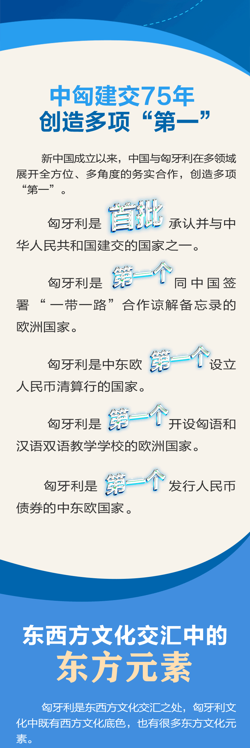 中國(guó)與匈牙利的傳統(tǒng)友誼源遠(yuǎn)流長(zhǎng)。建交75年來(lái),雙方在國(guó)際事務(wù)中相互支持、密切配合。近年來(lái),在兩國(guó)領(lǐng)導(dǎo)人的戰(zhàn)略引領(lǐng)下,中匈關(guān)系始終保持高水平發(fā)展。雙方政治互信不斷加深,互利合作成果豐碩,人文交流豐富多彩,在國(guó)際和地區(qū)事務(wù)中協(xié)作良好。