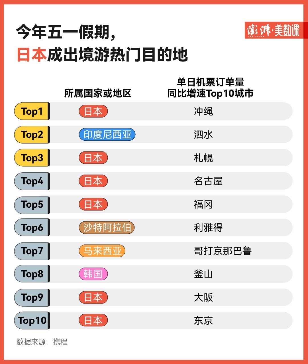 除了國內(nèi)旅游市場的火爆之外,“五一”出境游已經(jīng)加快復(fù)蘇。從攜程提供的數(shù)據(jù)看,今年“五一”假期,日本成了出境游熱門目的地——相比2023年同期,單日機(jī)票訂單量同比增速Top10的城市中,日本的沖繩、札幌、名古屋等城市分別占據(jù)了六個席位。