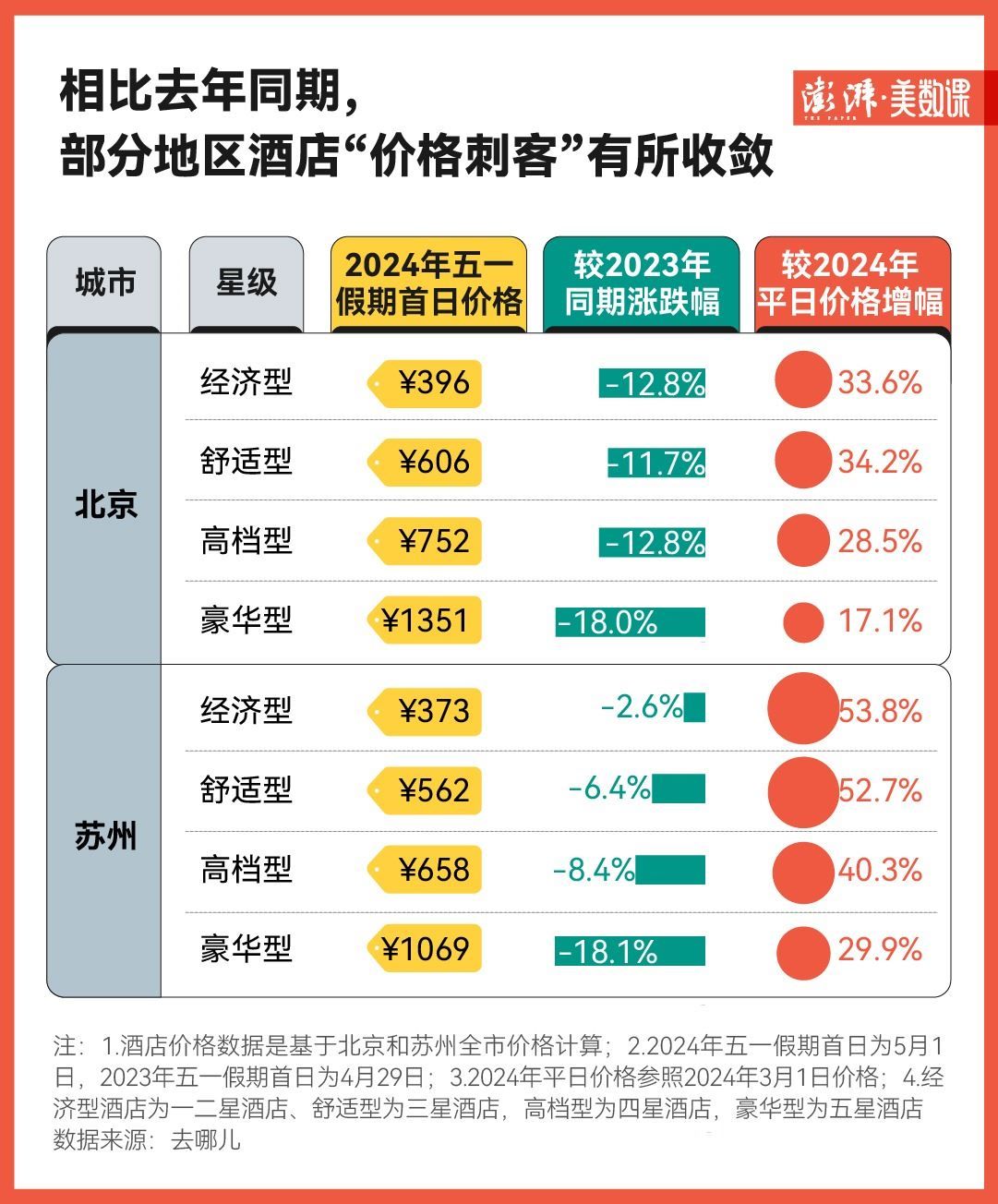 而相比去年“五一”假期酒店的“價格刺客”,今年假期的酒店價格實際上已經(jīng)有所回落。以回落幅度最大的豪華型酒店為例,北京在這個檔次上的酒店平均價格為一晚1351元,相比去年跌了18%的價格。