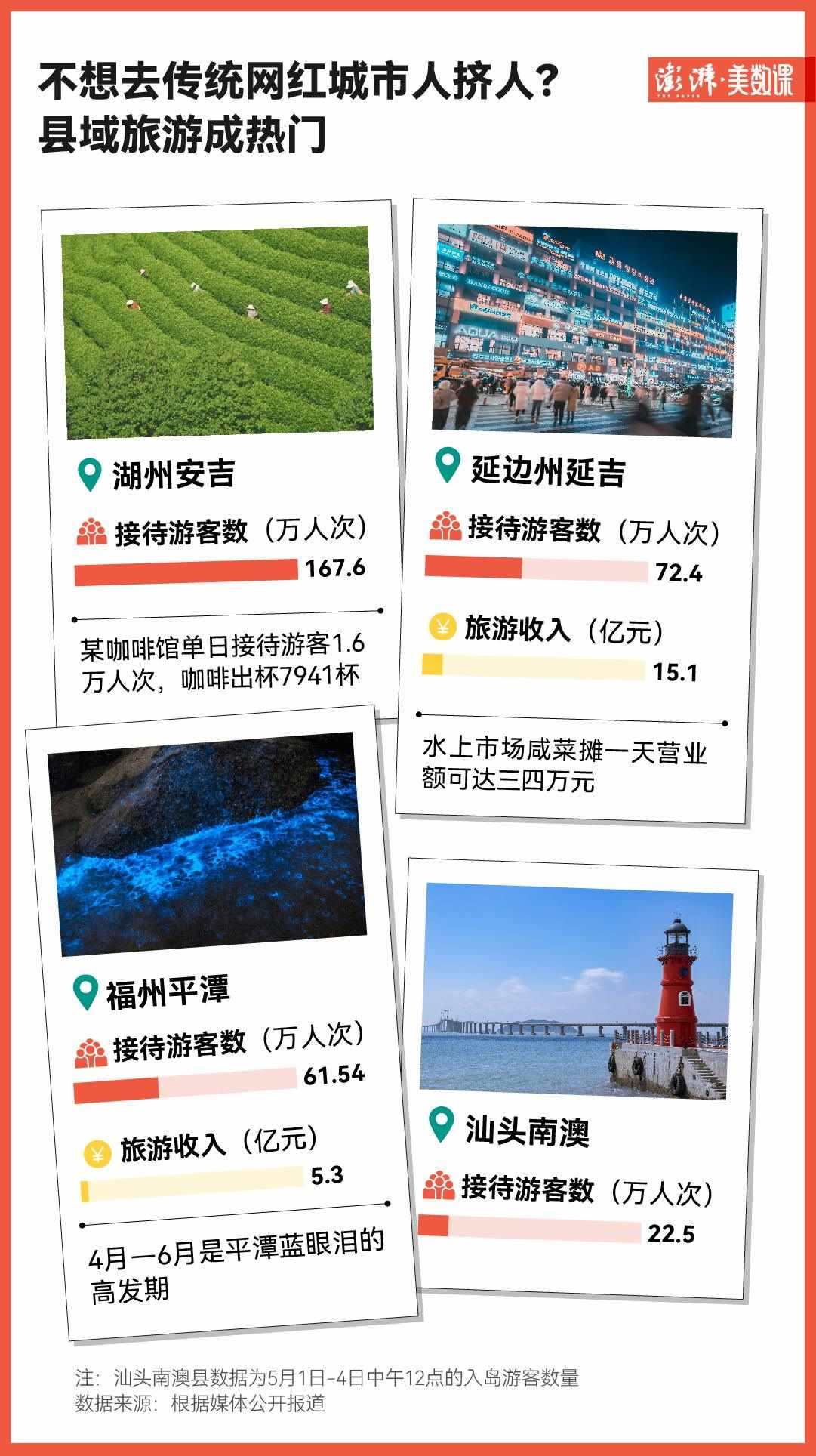 不僅如此,旅游下沉化的趨勢已經(jīng)來到了縣級市。湖州安吉在這個“五一”假期就收獲了167.6萬人次的游客數(shù)量。據(jù)“安吉旅游”公眾號,當(dāng)?shù)啬晨Х瑞^單日接待游客1.6萬人次,咖啡出杯7941杯。