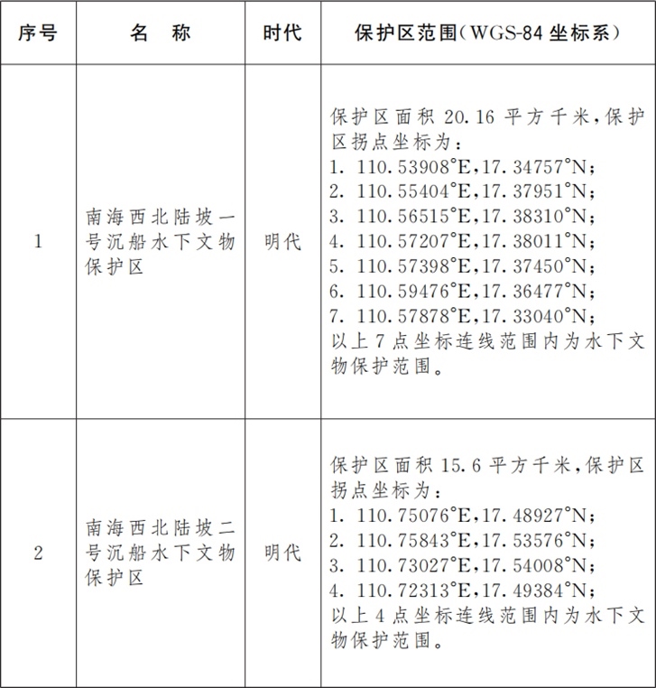 ·國(guó)務(wù)院核定公布南海西北陸坡一號(hào)、二號(hào)沉船水下文物保護(hù)區(qū)名單。