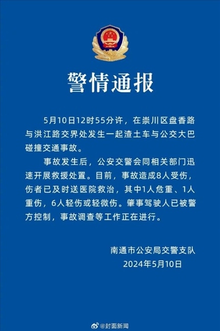 ·江蘇南通一大巴車與渣土車發(fā)生碰撞,警方通報(bào):事故造成8人受傷,傷者已送醫(yī)救治。