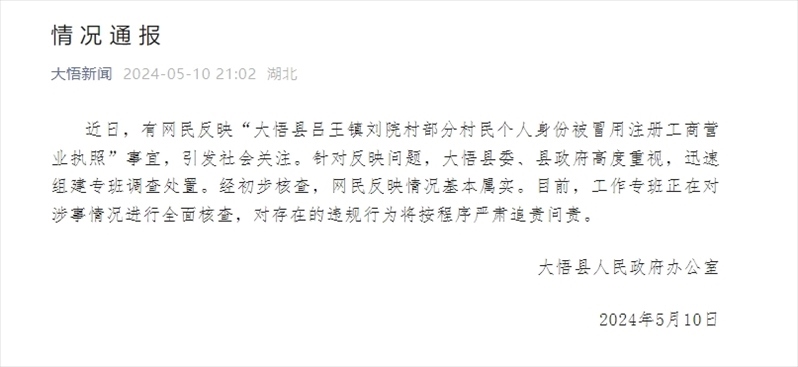 ·湖北大悟百余村民反映身份被冒用注冊(cè)個(gè)體工商戶,湖北大悟縣通報(bào)。